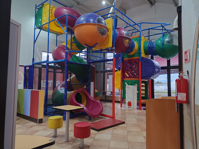 Hoy fuimos y pedimos con un cupón que sacamos del chat de WhatsApp. Íbamos a pedir 2 hamburgesas, 2 papas grandes 2 refrescos pero no tenían agua, tampoco tenían refresco. Entonces lo cambiamos a solo hamburgesas y papas, con 2 botellas de agua. Cabe decir que las papas estaban bien, pero las hamburgesas tenían un sabor muy pobre. Además, como éramos 2 adultos y 2 niños queríamos estar en el área de juego, pero había un problema de que en esa área solo había unas 4 mesas para 2 personas y solo una para 4. Tuvimos que esperar que se desocupara y rápido pedimos que viniera alguien a limpiar.