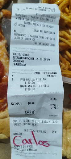 Anteriormente había ido a comprar pizza con orilla de queso en la nueva sucursal de zona centro la cuál estuvo deliciosa y con bastante relleno. Vine a este establecimiento esperando lo mismo pero fue un completa estafa ya que ninguna rebanada traía queso, solamente traía el bordo con más masa pero sin relleno. Jamás volveré a comprar ahí. GRACIAS POR LEER MI COMENTARIO, YA...