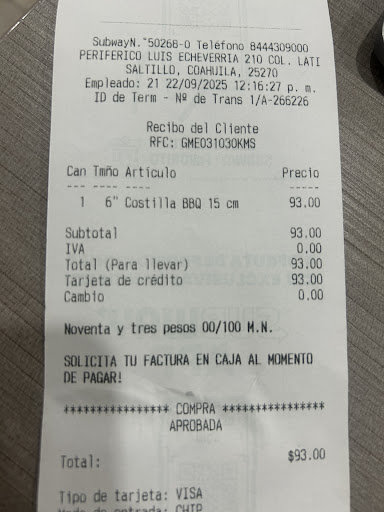 Read moreLa peor sucursal de Saltillo, alimentos fríos, mal preparados, ha ido varias veces ahí porque es el que queda más cerca de mi casa y siempre están jugando los empleados, la atención es pésima, el cuidado del producto...malo, no he tenido ni una buena experiencia ahí en los años que he pasado y cada vez que paso imagino que podría ser diferente... Continúa siendo una pésima sucursal, los alimentos los preparan como quieren, pedí sin las cantidades que deben llevar (ejemplo en un sub de 30 cm dos rebanadas de queso).Ojalá que los propietarios de este lugar en específico hagan...