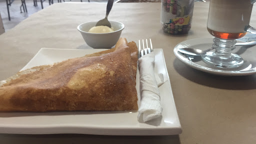El café se encuentra en el segundo piso de la plaza. Tiene mesas en la terraza y en el interior. Cuentan con el estacionamiento principal y otro a un lado. El lugar y los baños estan muy limpios. El menú tiene de todo, crepas, tes, vinos, café, panini, cuernitos, etc. Tienen juegos de mesa, es un lugar tranquilo. En cuanto a precios por ejemplo una crepa de nutella cuesta 90 pesos y está acompañada de nieve. Las tazas donde te sirven son muy pequeñas. Muy buena atención y no se tardaron...