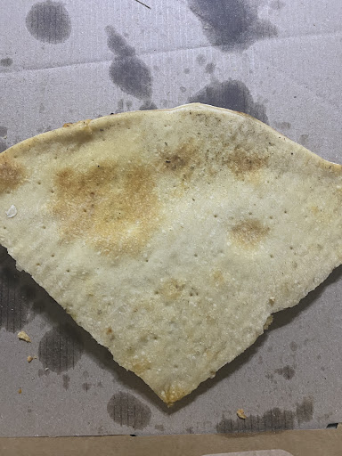 Mmmh, tal vez esté equivocado. ¿Utilizan masas precongeladas y precocidas para la pizza? Voltee las rebanadas y vi que tienen hoyitos y el patrón de fabricación industrial que este tipo de masas tienen. De igual manera sea así o no el pan está duro, lo calenté en microondas y en plancha y sigue duro…. Cuando se enfría se pone chicloso. No pienso volver a pedir...