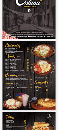 Read moreEn el centro histórico de la ciudad se encuentra este restaurante que si lo ves por fuera, no atrae mucho, sin embargo, una vez que entras la variedad de platillos de atrapa. Si buscas comer platos típicos colimenses este es el lugar, desde enchiladas , sopitos, sopes gordos, pozole, flautas, y mucho más, el menú del restaurante colima es apto para todos los gustos y sobre todo para el bolsillo, pues el platillo completo más caro, ronda los $90. Si vienes de visita a la ciudad y requieres factura, no lo pienses más y conócelo, porque un plus que ofrece el lugar, es justo la facturación...