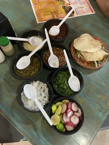 Al llegar colocan unos pequeños platos como parte de las salsas y cosas para botanear un poco. Salsas, frijoles, tostadas y nopales.