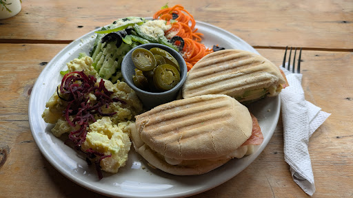 Este sándwich de desayuno fue bastante bueno. ¡El pan estaba perfecto! El interior estaba jugoso y delicioso. El plato también venía con ensalada y ensalada de papa. Algo que me encanta aquí en México es que todo el jugo de naranja en los restaurantes es recién exprimido en el mismo establecimiento. ¡Lo mejor! El jugo de naranja de producción industrial ni se acerca. También preparan batidos deliciosos y ofrecen leches alternativas si...