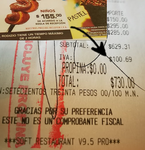 Solo el detalle de la propina 😞... I actually LOVE this place. It's got great service, great food, good atmosphere. It's definitely a place for meat lovers! You practically need to fast before coming. The drinks are great, the place is clean, the bathrooms are nice. Here's the only ONE thing I didn't like: one of the more recent times we went (March 2020) after receiving the check and paying, the waiter came back and told my husband there was a mistake because the tip he left wasn't "enough". My husband replied there was no mistake but the waiter then insisted, saying the tip wasn't a full 10 percent of our bill. (Check Ley Federal de Protección al Consumidor, my friends. It's not USA) He looked at all of us and then stood there, stretching out the bill like he wasn't going to leave until we paid the 20 pesos difference. I mean, I'm not saying they didn't deserve it, but it was SUCH an awkward moment! I was in shock. The place was full, so the other two tables next to us obviously noticed. It was ugly. Nothing like that had EVER happened to me before. In ANY restaurant. I still go, it's too good to boycott, but that moment was definitely a fly...