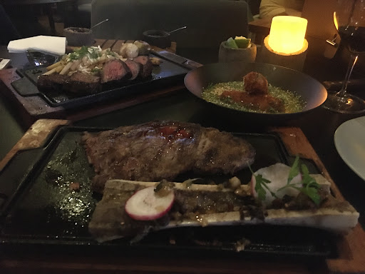 First time here to celebrate wifeys bday, and wasn't sure if it was a bar, a discotheque, a fancy restaurant or perhaps a combination of all three. Theres a huge tv right in the front center playing loud music videos. After we ordered, I noticed a large group of waiters just standing at the bar and eyeballing our table. Then some random ball headed dude, perhaps the manager, came to our table to ask if everything was ok. Other than those small and creepy events, the food arrived and it was great, we had the tuna steak, grilled octopus and somekind of shrimp with mezcal which the waiter flambé right in front of us. The bottle of tempranillo really hit the spot. Then they brought us 2 cakes with the fireworks and the whole team of waiters clapping their hands to wish a happy bday while our waiter was preparing a carajillo right in front of us. Overall, the menu is a little overpriced. I give them 3 stars for the attention to detail and the 2 shows right at our table. It was very entertaining. Thanks for doing your best and making us feel...