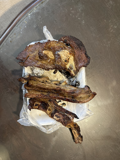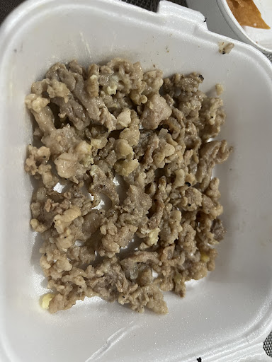 Se pidió un kilo de costilla por medio de Uber, se cuestionaba si el repartidor se robó media charola, ya que las 3 costillas y media que llegaron nos hacía creer que así fue, y después vimos en una de sus últimas calificaciones de aquí de Google que fuimos bendecidos al recibir algo por una chica que pidió medio kilo 🙏 Literal lo nuestro era casi el doble que esa foto por poquito, lo cual no llega ni a los 600 gr, seguramente la báscula no funcione muy bien porque eso pesado en crudo para nada es un kilo, está bien que como negocio tengas Rango de 100 a 150 g de error pero eso parece ya mucho. En fin vimos las fotos del lugar en Google y parece una gasolinera así que para nada se recomienda ir y última vez que se pide muy rica la carne y todo pero era más verdura que carne, mucho pico de gallo y poca carne, seis tortillas para un kilo y media salchicha asada para un kilo también.