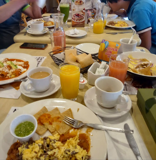 Muy amplio y limpio lugar, todos son muy amables y el servicio es rápido y atentos. El precio me parece un poco alto pero tienen mucha variedad en su menú y la mayoría de los platos si llegan bastos de comida. En cuanto a nuestra orden, los platillos llegaron rápido y se veían bastante bien, pedimos desayunos en paquete así que incluían café y un jugo, el jugo estaba bien pero los cafés nos los sirvieron ya algo tibios, esto no fue gran problema ya que el café es rellenable. Ahora con la comida 2 de los platos llegaron también ya tibios, nuestra mesera fue amable y los calentaron sin problema, aquí mi padre ordenó chilaquiles con pollo desmenuzado (platillo 100% recomendado) y decía que traía cebolla encima, mi padre es alérgico y lo ordenó si ella, si cumplieron con la petición especial pero no sabíamos que el pollo trae también cebolla revuelta, supongo le ponen para sazonar y no venía explicado en el menú, la notó y la separó pero ya no pudo terminar su platillo por completo. También conmigo yo ordené una porción de frijoles refritos extra la cual nunca llegó, si le estuvimos comentando a la mesera y checaba continuamente si la tenían lista pero creemos no se la pusieron en la cocina, esto al menos no lo cobraron en la cuenta al final, así que pienso que en el flujo de información los extras en cualquier orden se comunican pero son los más probables a pasar desapercibidos y olvidarse al servir...