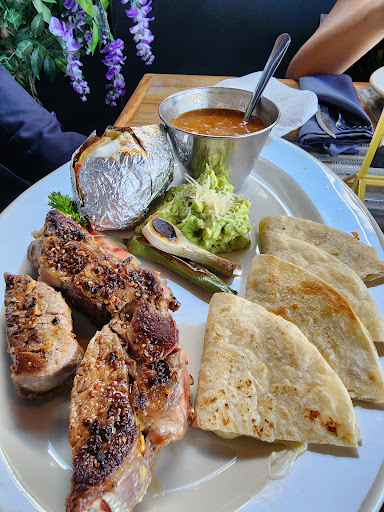 Los totopos que nos dieron de entrada estaban muy duros y sin sal. Sin embargo, el trío de salsas estaba riquísimo: cada una era picante, pero también estaba llena de otros sabores. Pedí las brochetas de mar y tierra, una guarnición de guacamole y una naranjada. Cuando llegó el guacamole, no me trajeron los totopos sazonados que debían venir, sino que me dejaron con lo que quedaba de las totopos rancias en la canasta. Probé el guacamole y estaba absolutamente insípido. De hecho, le añadí cucharadas de cada salsa para que estuviera lo suficientemente sabrosa como para no desperdiciarla. Las brochetas tenían deliciosas verduras asadas (me gustó especialmente el toque de salsa de soja en los champiñones), pero tanto el filete como los camarones estaban terriblemente cocidos y mal servidos. Había más guacamole insípido en el plato, además de frijoles insípidos, y un puré de papa increíble. Eso por sí solo promete. Como muchos otros críticos, creo que El restaurante tiene un gran potencial, pero la comida debe mejorar si quieren alcanzar ese potencial. Diré que la comida era muy asequible, pero si regreso espero que la comida esté a la altura de esa...