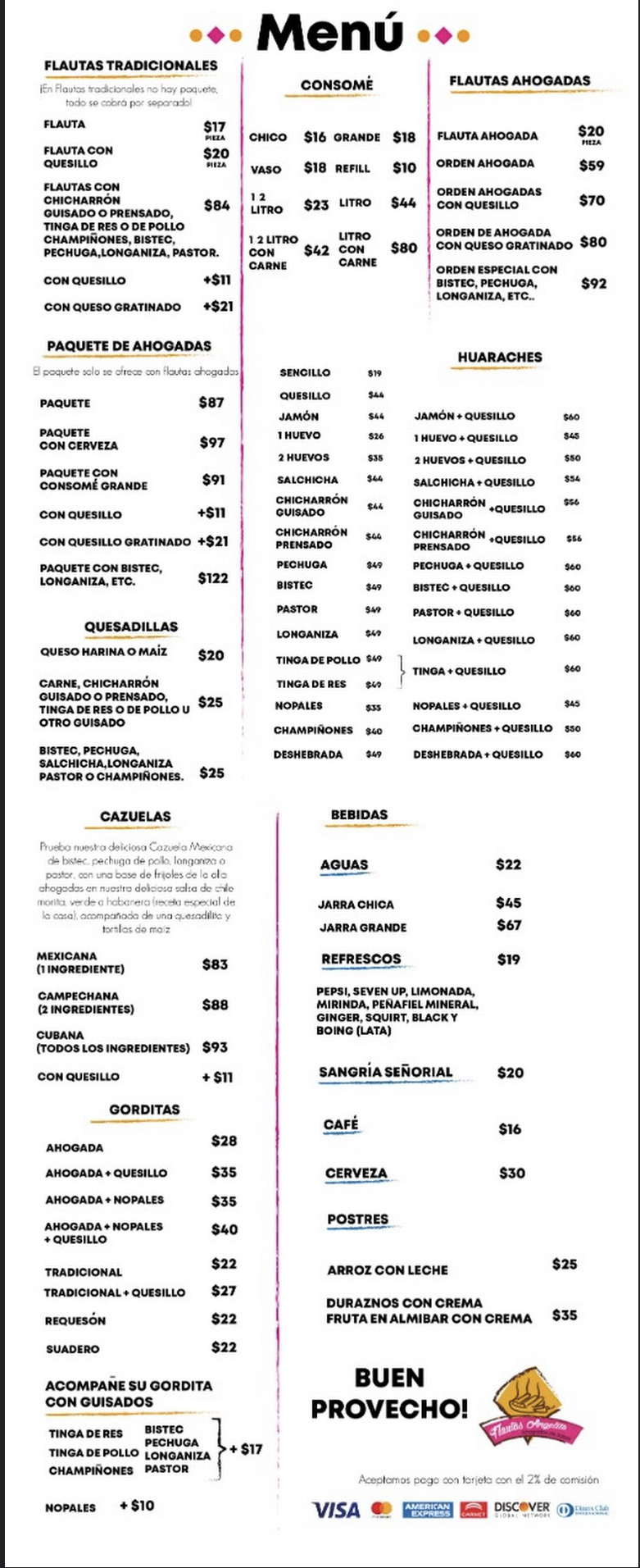 Read moreUn lugar no muy grande que hay que esperar para que te asignen una mesa, pero para mí gusto valió la pena la espera. El platillo principal son las flautas ahogadas que de igual manera las puedes pedir solas sin salsa solo queso y crema, también puedes pedirlas doradas medias o suaves pero a mi gusto lo mejor son las crugientes, hay otros platillos como el consomé que también está muy rico y un poco picoso. Por la parte de las flautas la salsa de las ahogadas no es tan picante hay las de salsa avanera pero la verdad a mi gusto que no como demasiado picoso las salsas están comibles sin mucho picante con el toque y sabor picoso pero nada exagerado. Existen paquetes que incluyen el consomé las flautas y un café por 120 pesos el paquete, con este paquete es suficiente para una persona que come...