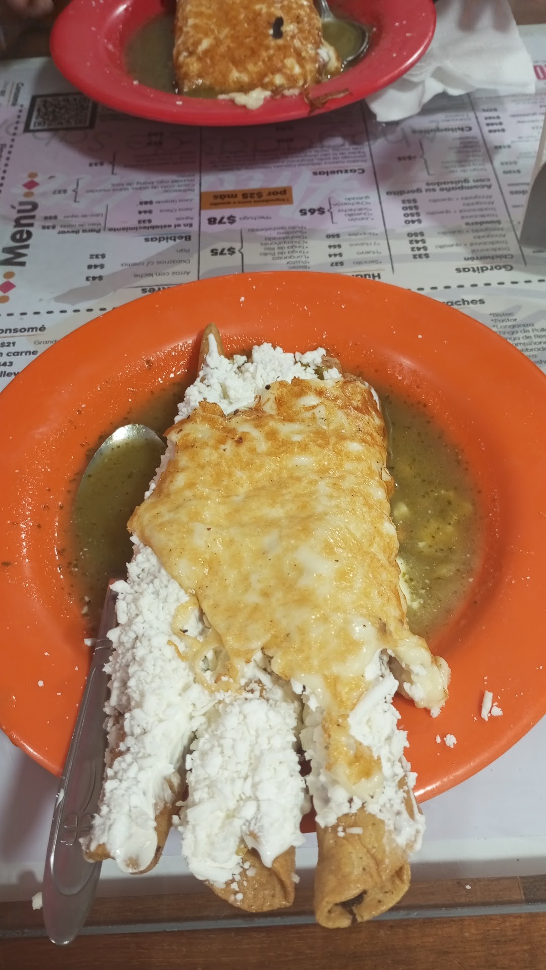 Exquisito...!!! No me espere encontrar tanta delicia en un platillo tan simple... Obvio su especialidad son las flautas pero las hay con varias opciones deliciosas... Ahogadas o fritas y también hay gorditas y algunas otras opciones más.... Si llegas temprano podrás disfrutar de un rico consome en el menú ... También hay aguas de Tamarindo, horchata etc y postres como arroz con leche... 🙂... La verdad todo muy rico... Y el lugar super limpio y con todas las medidas de limpieza requisitadas... Lo único es q no hay mas q menú digital (tienes q escanear código Qr) ... Si no eres quejumbroso te prestan una carta física... Esperando q después no te pongas a subir quejas a la red x q te dan cartas posiblemente contaminadas 🤦♀️... Bien el servicio de los meseros... Para estacionarse pues la callesita.. No hay mas... Pero hay lugar para q quede...
