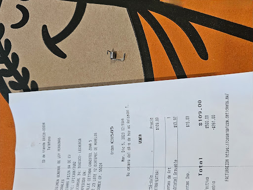 Read moreMe pareció de mal gusto que en este establecimiento te quieran vender lo que los vendedores quieren solo porque según ellos no tenían cajas y eso era nada más las pizzas de 89 y 99 pesos y si tenían cajas para las de 119 pesos, no s supone que todas las cajas son del mismo tamaño??? Deberían checar eso porque no es un establecimiento que venda 50 pizzas al día y menos en un día...