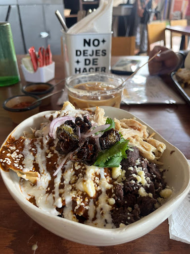 La comida de este lugar es muy rica, los chilaquiles con mole estuvieron buenísimos, aunque la verdad un poco más de mole habría quedado perfecto, ya que los totopos del fondo estaban secos. La porción de pollo fue muy escasa, peeeero, de sabor, delicioso! Además, las opciones de comida o desayuno son muuuuy amplias, para todos los gustos! Las enchiladas rojas con el chicharrón de queso están deliciosas. El sándwich, buenísimo. Siempre en perfecta presentación y exquisito.