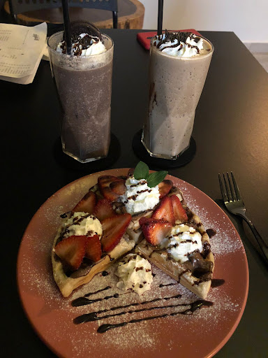 Delicioso sabor, excelentes instalaciones, precios justos y buena música. Lo único malo que puedo decir (cabe mencionar que tal vez fui caso especial) es que pedí un frappé y no estaba bien molido, tenía grandes trozos de hielo sin triturar lo suficiente, por lo que fue imposible tomarlo por la pajilla y tuve que tomarlo con cuchara. El día que fui no tenían crepas y tardaron un poco en servir los alimentos pero eso no me molesta porque sé que esperar es parte de un buen procesamiento de los mismos y...