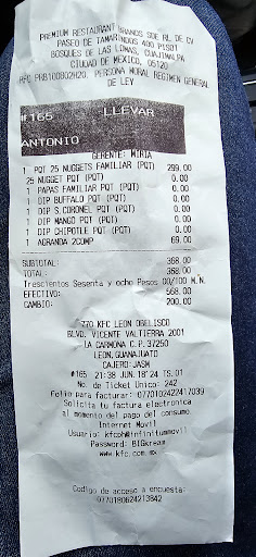 Read moreEl pollo está bueno ,buen sabor, aunque si no gustas de la comida con grasa es mejor que lo evites. El puré y la ensalada me encantan desde hace más 30 años me ha gustado. :). Hoy tuve la mala experiencia de que compré un megabox y no me pusieron ni el bisquet, ni puré ni ensalada, sólo el pollo y el refresco. No lo distinguí en el momento porque lo compré junto con un paquete familiar de 16 piezas, y me confié en que harían bien su trabajo pero no fue así. Aconsejo que como cliente revises siempre mejor cada orden que compres aquí, porque no es la primera vez que se equivocan y lo curioso es que nunca se han equivocado en ponerme de más productos. (Actualización: Reporté el problema en la encuesta que viene en el ticket y me dieron otro paquete igual sin costo. Se agradece) El precio es lo justo no considero que sea caro ni barato. El lugar se observa con poco mantenimiento y el interior da la sensación de estar sucio...