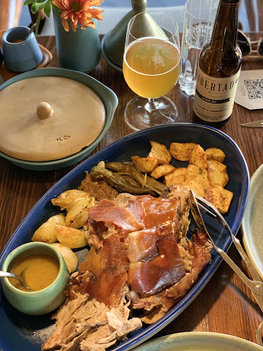 Plato fuerte, lechón ahumado horneado por 6 horas, acompañado de cebollas asadas, chiles toreados y papas horneadas. Un plus para este plato es que te dan un vaso con jugos de la carne para mantener hidratada y probar todos los sabores. Su temperatura del alimento estaba excelente y solos los sábados tienen este platillo.