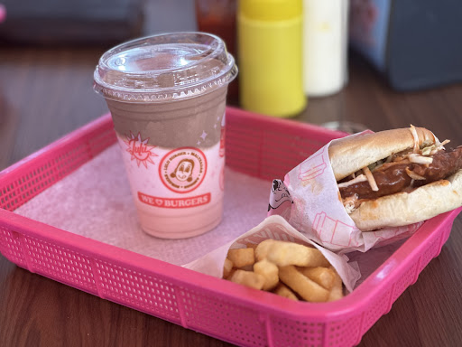 Read moreSolicité para que me llevarán la comida, la atención muy buena, el branding de la marca está increíble, ese color rosa te hace creer que va a estar delicioso! Y la verdad me lleve una decepción, la hamburguesa estaba muy salada, pedí un combo doble, las verduras estaban frescas, bien ahí, la carne era muy salada y vaya que soy una persona que no se "sala" con cualquier cosa, el tocino tenía buena consistencia estaba crujiente, pero también muy salado, en general a la hamburguesa no tenía un sabor peculiar, algo que la hiciera distinta y sobre todo que hiciera valer lo que cuesta... La presentación de la comida para domicilio estaba bien, bien cuidado, no estaba frio ni batido. Las papas fritas, uufaas... tenían la consistencia perfecta, pero desafortunadamente las hicieron con aceite muuuuy quemado, de sal estaban bien, pero sabían a aceite ya quemado, triste por eso. La malteada de mazapán estaba increíble.