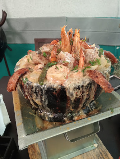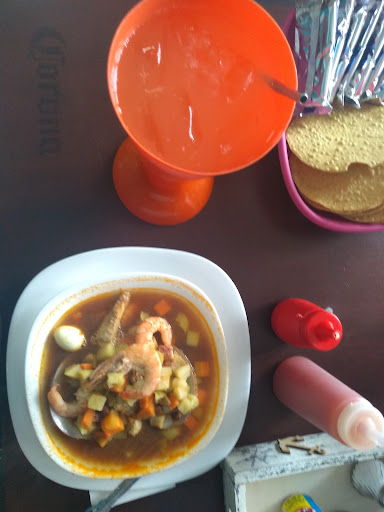 Platillo: Sopa de mariscos Es un plato exuberante con diferentes ingredientes: camarón, almeja, filete de pescado, calamar, ostiones, adornado con jaiba y un ingrediente extra que le da buen sabor: huevo de codorniz. El platillo lo recibí a los 5 minutos, y eso me sorprendió. El caldo bien caliente y con el sabor necesario para acompañarlo con alguna salsa de su elección. El tamaño de la naranjada también fue una sorpresa, como se puede ver en la foto.