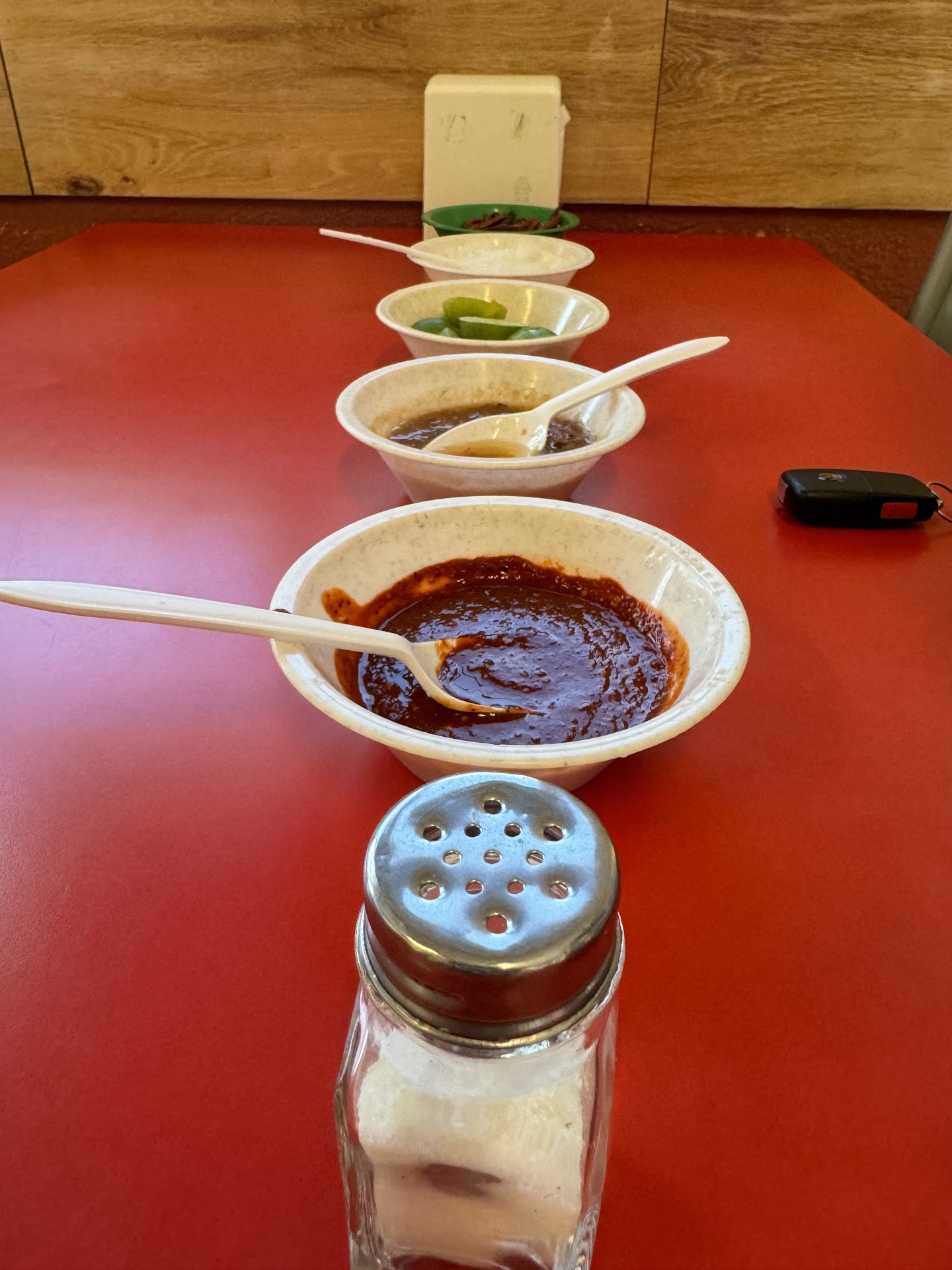 Solo un detalle, en estos momentos tienen una atención para llevar muy bien organizada haciendo fila en auto, pero . . . Sirven diferente, el domingo pasado compré en dos ocasiones a las 8:40 h compré dos platos grandes y muy bien servidos, regresé a las 12:00 h y pedí dos platos grandes y cuando mucho me dieron uno y un cuarto del otro, como llevaba olla y no ves cuando te sirven, entonces no puedes hacer otra cosa que confiar y pues no, no sirvieron igual, eso...