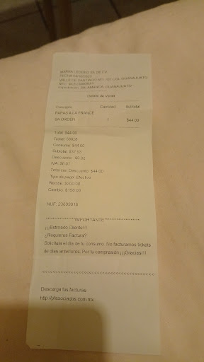Hoy miércoles 4 de octubre, acudà a esta sucursal a comprar un pollo y unas papas a la francesa, pague en caja y la chica que realizó el cobro solo me dió ticket de las papas a la francesa y solo venÃa reflejado ese cobro de 44 pesos, cuando me cobró 130 del pollo y 44 de las papas! Cuando me di cuenta que en el ticket solo venia reflejado el cobro de las papas, le comenté que me diera el ticket del cobro del pollo y si me dió uno, pero al llegar a casa và que era la reimpresión de otra venta! Asà que esto claramente se puede reflejar como un robo a su...
