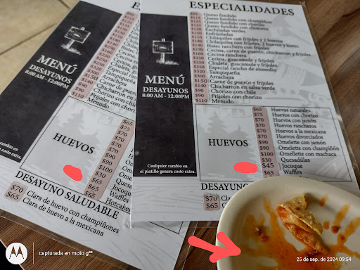 Esta ocasión fui por primera vez con mi familia y cuatro invitados. Ordenamos café de olla, una de las tasas aún tenía labial a la orilla de la tasa y otras tres aún estaban sucias por fuera. Uno de mis invitados ordenó los chilaquiles con huevo, frijoles y bistec pero le trajeron un platillo sencillo, la mesera se ofreció a ordenar el bistec pero ya casi estábamos por terminar y mi invitado decidió no ordenar por el tiempo. Yo ordene un omelette de jamón con una porción extra de champiñones y me trajeron huevo revuelto con jamón y una ración muy pequeña de frijoles y sin queso. La mesera se percató que me habían dado la porción equivocada pero desafortunadamente ya era tarde para cambiarme el platillo correcto ya que yo le había puesto un poco de salsa y esa fue la razón por la cual no se pudo hacer nada al respecto. Después de los pequeños incidentes la mesera creo que se puso nerviosa y en varias ocasiones se le olvidaba traer las cosas que nos hacían falta como la leche para el café, el queso para mis frijoles, mi invitado pidió una coca la cual también se le olvidó traer hasta después de rato. Entre otras cosas la comida estuvo más o menos los precios son muy accesibles y las porciones...