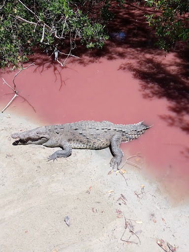 The salt water estuary next to the restaurant is a vivid dark pink (we have been told the color is seasonal). That alone is unique. The iguanas are everywhere. And then there is the restaurant's namesake... A 10' salt crocodile who regularly suns himself just outside the patio.