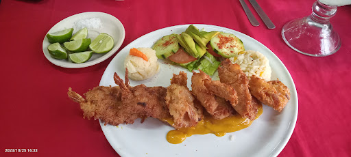 Así que decidí probar los camarones de coco sobre los que todos han escrito .... No es un gran cosa, yo acomido mucho mejor. Primero no estaban frescos... O tal vez era solo el aceite en el que estaban fritos, también la masa era pesada, no era horrible, simplemente no le llama atención a el apetito. La extraña pasta de cítricos que se sirve debajo de los camarones tiene un sabor extraño, especialmente cuando se come con el plátano frito con el que viene, una vez más, raro y sin gusto. Sorprendido, el arroz se sirvió frío que acompañó a los camarones. Larga historia corta, si realmente quieres ricisimos camarón de coco... A solo un minuto de distancia, acrusar la calle, encuentras es el mejor camarón de coco en Zihua. El Diablo me hizo escribirlo.