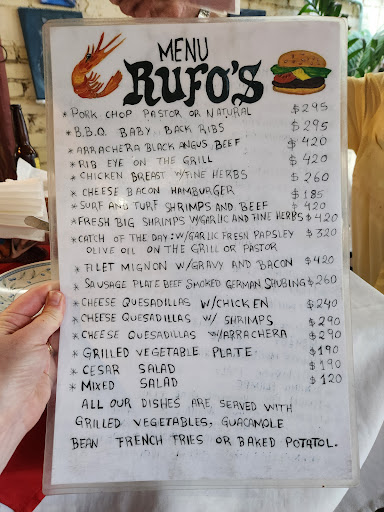 We went to Rufos Grill last night. We had noticed nice live music coming from there most evenings and it had good on-line ratings. We ordered the 2 fresh seafood specials of the day - tuna and mahi mahi (dorado). We also ordered a beer and an agua mineral (soda water). The beer and soda water were as expected. The fish was limp and tasteless (I couldn't finish it), veggies not cooked at all. The baked potato was a small scoop of mashed potato in a foil wrap to make it look baked. This morning we suffer the inconvenience of having to be within range of a toilet (bano). Never again will we go to Rufos! And who is giving them good ratings?!? Other gringos I have talked to have had a similar...