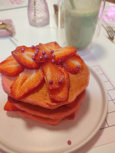 Probamos: Crepa de Philadelphia: sin sabor y la crepa estaba muy aguada, no crujiente Bebida pink latte: es una bebida rosa con glitter dorado, elaborada con extracto de 2 vegetales. No tiene sabor definido, sabe a algo como leche caliente con verdura, además que el glitter se sedimenta y parece que tomas leche caliente con sabor raro y polvo. Hot cakes: creo que es el único plato rescatable de lo que probamos ese día. Pero aún así no son ricos. La otra bebida, la color verde, fue algo de matcha sin azúcar, no recuerdo el nombre, pero es un te amargo con leche 😪