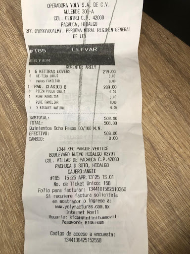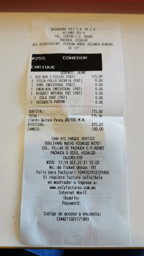 Como fan del pollo de KFC es decepcionante que por culpa de personal deshonesto en general le arruinen a uno la comida. Hice un pedido en Didi Food, paquete de 10 piezas, de las cuales 3 debían ser bbq, y dos ensaladas como complementos ya que nunca nos ha gustado el puré. Enviaron lo que les dió la gana, sin contar que en en miércoles suelen dar piezas gratis en compras de paquetes de 8 piezas en adelante, nos enviaron solo 8 piezas de 10 pagadas, solo piernas y muslos (habrá a quién le fascinen estas piezas, pero en nuestra casa son las que tiramos a la basura, por lo que nos vimos obligados encima a comer algo que no nos gusta) si uno va a comprar un pollo ej. Rostizado no te dan solo muslos y piernas, las recetas venían mezcladas, enviaron los complementos que quisieron, la aplicación ni siquiera nos hizo reembolso por las piezas faltantes. Recomendación NO PIDAS EN LINEA y revisa bien tus pedidos antes de retirarte si vas a la tienda física. Que mala onda por parte del personal, por nuestra parte última vez que consumo...