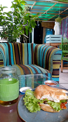 Es un café increíble, la decoración es en pocas palabras arte, naturaleza y reciclaje. El ambiente es muy chill, buena música todo el tiempo, suele haber eventos de música y arte en vivo, y exposiciones temporales de artistas locales y nacionales. La comida es deliciosa y a precios muy accesibles, tienen bebidas de la región (pulque y cerveza de Hidalgo) y venta de otros productos locales como semillas, revistas, joyería. Es perfecto para el brunch, salir con los amigos, echar café y plática, o ir con la familia por un postre.