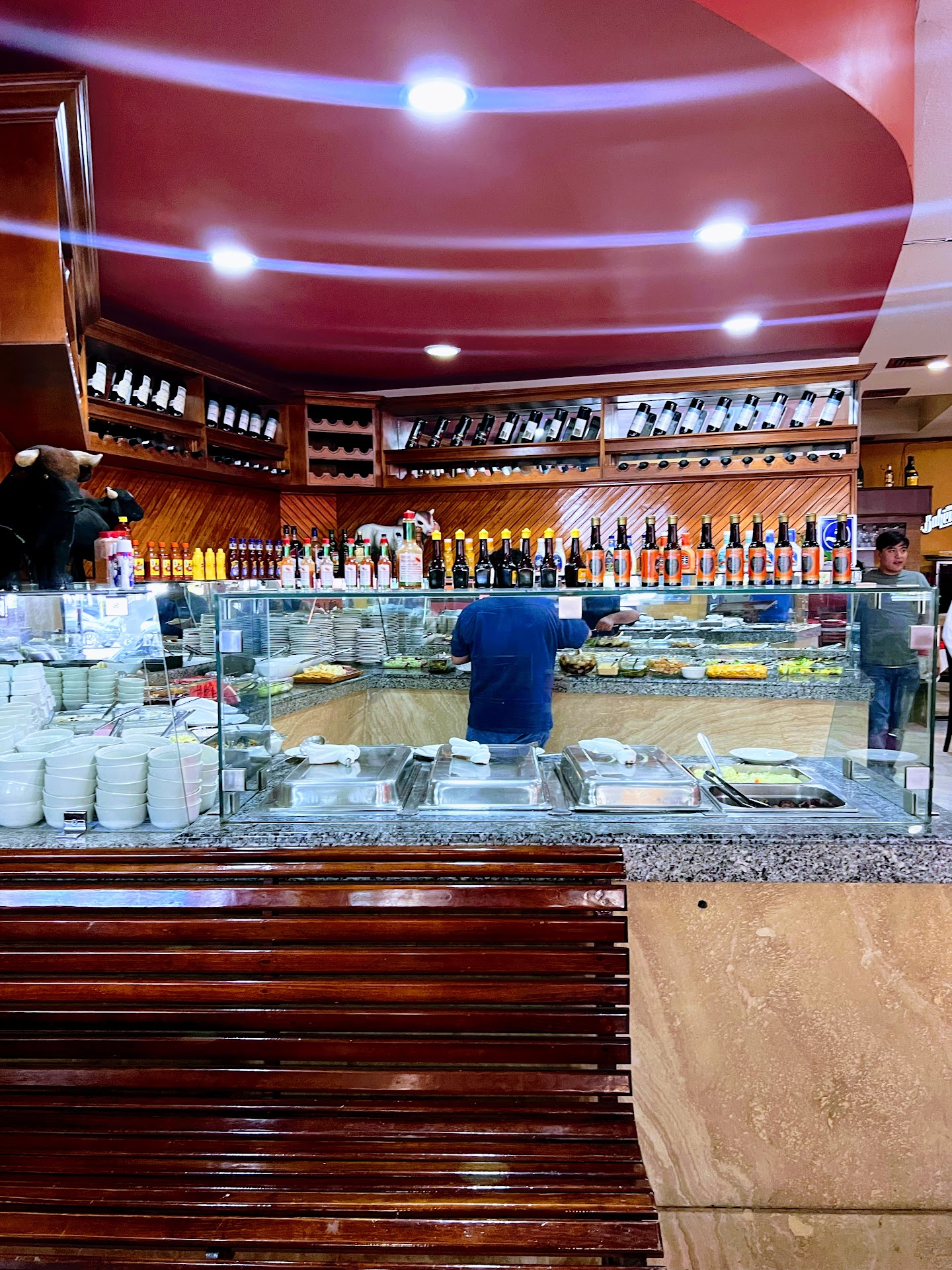 La carne o el buffet bueno por el precio de $179 después de las 7:00 pm pero algunos cortés sobre cocidos y otros un tanto faltos de cocción pero siempre puedes pedir sea cocinado más. Los panes con ajo y el otro aderezo buenos.