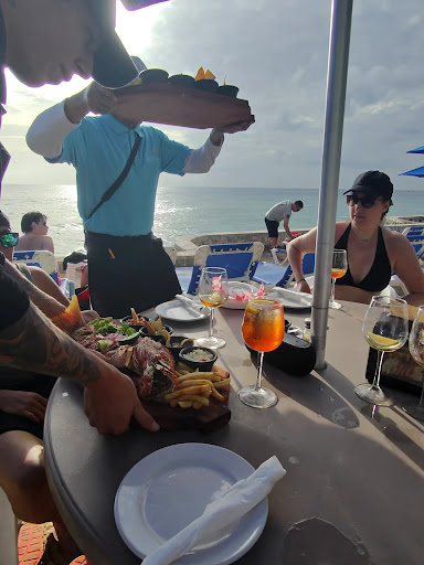 Let’s start with the pros: the location is stunning! There is a beautiful patio where you can dine right in front of the ocean. Want to take a dip? No problem—there’s a staircase into the water where many people swim and snorkel, and it’s very clear (no seaweed!). There are also a few beach beds for you to relax and soak up the sun. While it’s not an actual beach, the area they’ve recreated with sand and beach chairs works well.