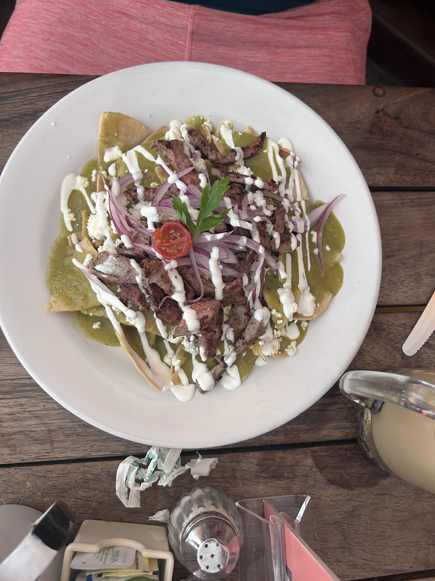 I ordered the chilaquiles, which were nothing short of amazing. I was genuinely impressed with how flavorful they were, especially given that they deviated from the typical Mexican chilaquiles. My mixed order came topped with succulent chicken, allowing me to sample both the red and green salsas, each packed with unique flavors. My husband opted for the green salsa with steak on top, and he was equally delighted with his choice.
