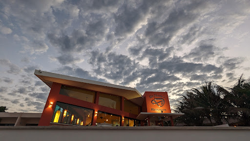 The view is amazing as it overlooks the ocean with an outdoor bar but couldn't be enjoyed on a rainy night.