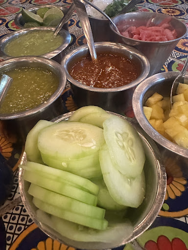 Once seated, you're greeted with a number of condiments or taco dressings to decorate your plate. They offer a red and green salsa, accompanied by a generously creamy avocado salsa option. Freshly diced pineapples, cucumbers, and red pickled onions, are also part of the ensemble of supporting characters that color the table. That's in addition to the typical favorites we're all accustomed to...white onions, cilantro, and limes. The spread of add-on items reminds me of Korean Banchan.