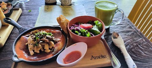 Read moreLa verdad es que estoy bastante DECEPCIONADA 🥹 Amelie era uno de mis restaurantes favoritos para desayunar, INCLUSO con la espera horrible de los fines de semana 😮💨 sin embargo, este fin fui y la verdad fue una decepción total. Pedí de bebida un matcha latte, de plato un sartén de pollo y champiñones y de postre un pan francés: El matcha fue la bebida más dulce que he probado, si están cuidando no comer azúcar, no se vayan por la opción "segura" de un té, ya que o no es puro y usan algún tipo de mezcla que venden endulzada y con sabor a vainilla, porque de matcha no tenía nada 😮💨 o utilizan leche azucarada (lo cual no mencionan) El Sartén 🤦🏾♀️ la base es una salsa de jitomate la cual no tiene ni un poquito de sabor y venía FRÍA, se acompaña con una ensalada que no tiene ni un poco de aderezo ni nada que la integre o mínimo sazone, por lo que es seca y solo sentirás el sabor a la lechuga. Dónde en verdad me perdieron fue en el postre... AMABA profundamente el pan francés y después de la mala comida y bebida dije, "no hay problema porque viene el postre", no pude estar más equivocada 🥹 un pan seco que no tenía ningún tipo de sabor a pan francés y que solo estaba ligeramente humedecido en algunas partes por el ácido de los frutos secos molidos.