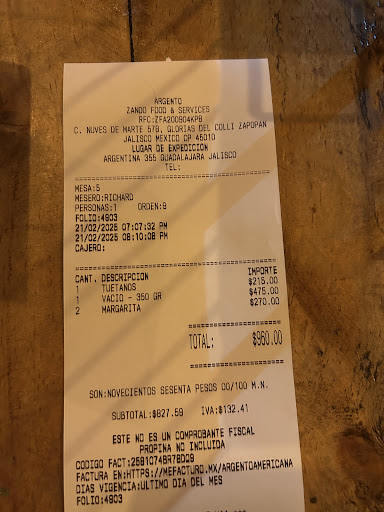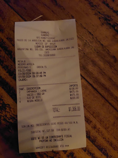En nuestra visita consumimos 4 cervezas Negra Modelo, 2 empanadas de carne, 1 ojo de bife 350 g y 1 vacío 350 g; pagamos $1438.80 MXN, incluido el...