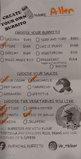 We ate at the Burning Burrito on three separate occasions during our seven day stay in Puerto Vallarta. It was about a three minute walk from our stay at the Molino de Agua. The staff was always very friendly and helped us with our order on our first visit. We ordered burritos on each visit so knew exactly what to do after our first visit. The burritos were huge and they tasted great. The burritos range in price from 115-185 pesos. My wife had the veggie burrito all three times and loved it. I had the steak burrito twice and the breakfast burrito once…both were terrific. The ordering process for the burritos is quite simple. They give you a “Create Your Own Burrito” sheet (see image) with all of the burrito options…you mark the meat that you want, the sauces, the vegetables, etc. Give them the sheet back and sit and wait about 7-10 minutes. We did carry out all three times that we ate here. They did have 4-5 tables if you wanted to eat inside. I am pretty sure they are cash only as someone finishing their meal while we were waiting had to make a quick run to the ATM for cash. There is an ATM machine right...