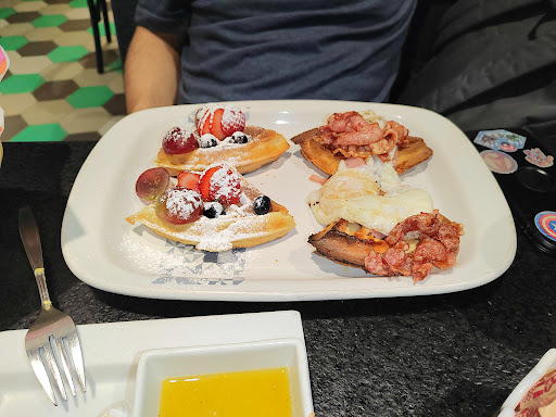 He visitado este lugar un par de veces y en ambas ocasiones dejaron mucho que desear. La mas reciente en diciembre de 2024, comencemos por el hecho de que los meseros no tienen idea de como debe estar una mesa lista para comensales. 4 personas pedimos café y en ningun momento nos llevaron azúcar, la tuvimos que solicitar. Esto sin mencionar que el café no tiene refill, y la verdad tampoco sabor, era como tomar agua caliente. Al llevar los platillos la mesa no contaba con pan para acompañar los platillos, tambien lo tuvimos que solicitar. 2 de los platillos solicitados incluian hotcakes, y en ningun momento llevaron miel o mermelada. Ya no quisimos volver a llamar a los meseros pues se veian muy ocupados platicando. Hay una chica que pasa con una canasta con pan dulce. Pero dicha persona decidio ir a ofrecernos el pan dulce hasta que estabamos comiendo. Si lo hubiera hecho justo despues de que nos llevaron los cafés muy probablemente hubieramos consumido este producto. Otros puntos que no me agradaron son que el lugar esta muy descubierto y se siente helado, esto hace que los alimentos se enfrien muy rápido. El sanitario esta en la planta alta, por lo que si una persona de la tercera edad o con discapacidad requiere hacer uso de el, pues no va a poder. Y por último el lugar esta muy mal iliminado, leer el menú en estas condiciones...