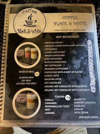 Read moreMy partner, his family, our friends and I came to this establishment on the Main Square of Ajijic right after dinner yesterday to close out the night. Black and White is a coffee shop where expats gather to have coffee and desserts enjoying people-watch or converse with others. They have many tables with umbrellas outside. The menu has tons of drinks to choose between hot and cold beverages as well as desserts. Some of us ordered the cappuccino, lemon pie, raspberry cheese cake, Oreo ice cream with chocolate shell and brownie with chocolate syrup. The desserts and drinks were delicious and tasty at reasonably priced. The service was slow as it was busy. This is cash only. We can...