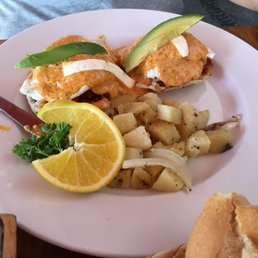 Eggs Benedict My spouse's correct dish. The hollandaise sauce was orange in color due to the addition of chilis, but he said the English muffin wasn't toasted and got soggy. Pass.