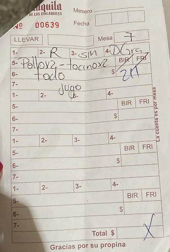 Total que yo tenía hambre y decidí seguir su jueguito absurdo, ya estaba ahí. Pedí chilaquiles gratinados + frijoles + bolillo + pollo ( este último carísimo por cierto) . Y cuando llega mi plato no les miento 6 pedacitos (pedacitos!!) de pollo. Al hacerle el comentario al encargado me contestó que ellos los gramos que te ofrecen son pesados en crudo (Yo he tenido mi propio restaurant y se perfectamente que proteínas como pollo o carne merman un 60% de su peso al cocinarse) así que si te ofrecen 60g de carne o pollo realmente te darán 24 gr!! Otro comentario que me hizo el encargado fué que hubiera pedido doble porción, para lo cual ya te sale más caro 12 pedacitos de pollo que los mismos chilaquiles + frijoles + pan jajaja … en fin al final ni sabes lo que pediste, lo que te cobraron. Sales con una experiencia extraña de ahí.