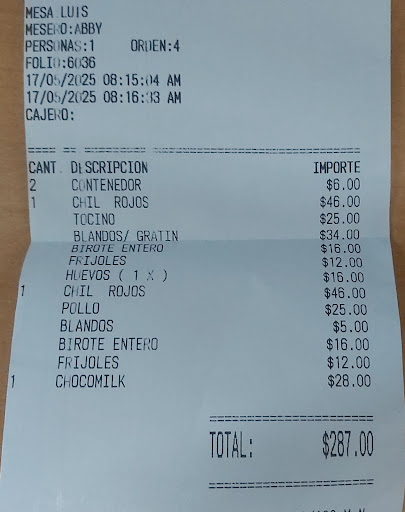 Read moreDecidí probar aquí el comprar desayuno. No quede convencido con todo. La atención no fue buena por parte de la cajera. Cambiaba el pedido y cosas lógicas qué le pedía, por ejemplo le dije sin queso y sin crema y me pregunto que si quería los xhialquiles sencillos o GRATINADOS (Queso derretido). Jamás te explican qué todo lo que te ofrecen lleva costo, el empaque para tu comida para llevar, el birote, los frijoles, el pollo, etc. Etc. Que el ingrediente extra qué le ponen te lo cobran caro en comparación de la porción qué te sirven. En ese momento había unas clientas antes de mi qué algo reclamaron, que no era la primera vez y decidieron recibir así el pedido e irse. En cuanto a calidad y sabor. Están buenos. Pero si escasas las porciones de ingredientes extras qué pides. Por cierto en este pedido para llevar. Me hicieron esperar 27 minutos después de tomar mi pedido