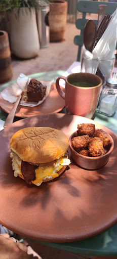 Read moreLlegué faltando 10 para las 12 y no tuve que hacer fila, algo poco común en GDL en domingo. Para tomar pedí un matcha latte y era matcha real, no mezcla con matcha, por lo que pude quitarle el endulzante. Pedí un panqué de plátano que tenía nuez y cacao, muy bueno y ligero. Para desayunar pedí el sándwich de huevo que tenía un sabor muy rico, el tocino crujiente y el queso derretido. Venía acompañado de tater tots que tenían muy buena cocción y sabor, muy crujientes. En general la atención fue buena, no tomó más de 15 minutos para tener la comida servida. En total pagué $265 por una bebida, un pan dulce y un platillo. Me parece justo para la zona y el tipo de lugar, muy bonito especialmente la fuente...