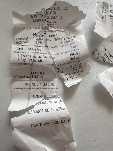 Seguido compro en esta sucursal, a mi me gusta mucho una nieve que es de frutos rojos de Pay y el día de ayer compré dos vasos grandes y cuando comencé a comer el mío ya llevaba la mitad y nisiquiera me había salido un solo trozo de pay que es lo que me encanta, regresé y le comenté a la chava y me dijo pues paga un extra era una morena que está en cajas como que ya tiene rato ahí trabajando porque seguido la veo y no quise alegar con ella porque para mí el Error lo tuvo la que lo preparó que no le puso los trozos de pays lo que no me Gustó fue que le di $20 pesos para que me le agregaran trozos de pay a los vasos y se embolsó el dinero y no me dio ticket ni nada. Y la chava que le entregue los vasos me dice ve y paga y le digo ya pagué ve y pregúntale a ella y la apunté no me dio ticket y le dice si da celos. Para que tengan cuidado !! Porque no es primera vez con esta chava en terraza oblatos, rompí el ticket de coraje y hoy me tocó armarlo ahí se ve la fecha de ayer y que dice Dairy queen creo que ahí dice el nombre de la que me atendió Samaela Serran y se me hizo injusto tener que pagar nuevamente cuando nisiquiera me agregaron nada de...