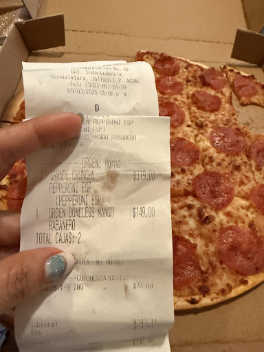 Read moreNo recomiendo pedir por app. En mi caso Solicite servicio por medio de Didi, y me informaron que Dominos realizaría la entrega, en mi caso nunca llegó la pizza. Me comunique con ellos en dos ocasiones una cuando paso 1 hora en la cual me comentó Dominos que ya mi pedido iba en camino, después de 30 min volví a llamar ya que en la app me aparecía como entregada la pizza, y yo nunca la recibí!! Así que en esta segunda llamada (a Dominos) les comenté lo que había pasado y nuevamente me dijeron que ya iba en camino. En ese momento le pedí de favor a la joven que me atendió que mejor me cancele el pedido me pidieron mi domicilio y que les dijera cuánto tiempo de demora había pasado, a lo cual respondí que 1 y 30 minutos.