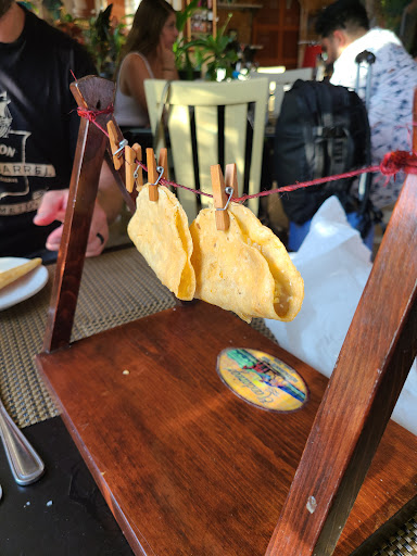 We have been staying at the all inclusive across the street and have not been thrilled with the food so we decided it was time to venture out. The ambiance in this place was amazing. Flowers/vines cover the exterior and some very unique artwork. Lots of fans and open ceiling that can be closed in the event of rain 🌧. The service was amazing! Large portions of food as you can see in the photos even from the kids menu. We each received a complimentary bean and cheese Taco (the hanging tacos in the pics). We ordered the table side guacamole, my husband got the enchiladas, chicken finger for my daughter and Mexican Steet Tacos for myself... 2 margaritas (huge) and a guava water and our bill with tip was around $75 US. My husband really enjoyed his food, I thought the tacos were decent and my daughter ate as much of her food as she could. Drinks, guacamole, the vibe and my daughter eating her food made it all worth it to us!! I would definitely go back. We didn't have room, but really wanted to try the flaming banana desert.