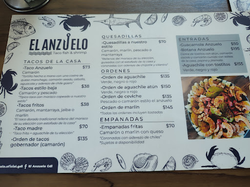 Entre las entradas, la botana Anzuelo es una opción perfecta para compartir, llena de sabor y textura que te preparan para el plato principal. El taco Anzuelo, sin duda, es el rey del menú. Su preparación impecable y su mezcla de ingredientes hacen que cada bocado sea una experiencia inolvidable.