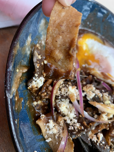 En cuanto a la comida, pedimos unos chilaquiles de mole, los cuales creo los hacen con totopos comerciales, los que me tocaron a mi estaban súper duros y no pude terminarlos, jamás se ablandaron ni un poco. A parte pedí un huevo estrellado (el cual te cobran aparte) y no me lo dieron, tuve que pedirlo de nuevo a la mesera ya que se le había olvidado. Lo pedí termino medio y me lo dieron casi crudo. Los chilaquiles venían con una rebanada de pan, la cual no pude comer tampoco porque estaba tiesa, no sé si el pan así deba ser porque ahí lo preparen, pero para mí fue incomible. Tuve que dejar mi comida a la mitad, no pude terminarla. También pedí un chocolate caliente y la verdad estaba muy insípido.